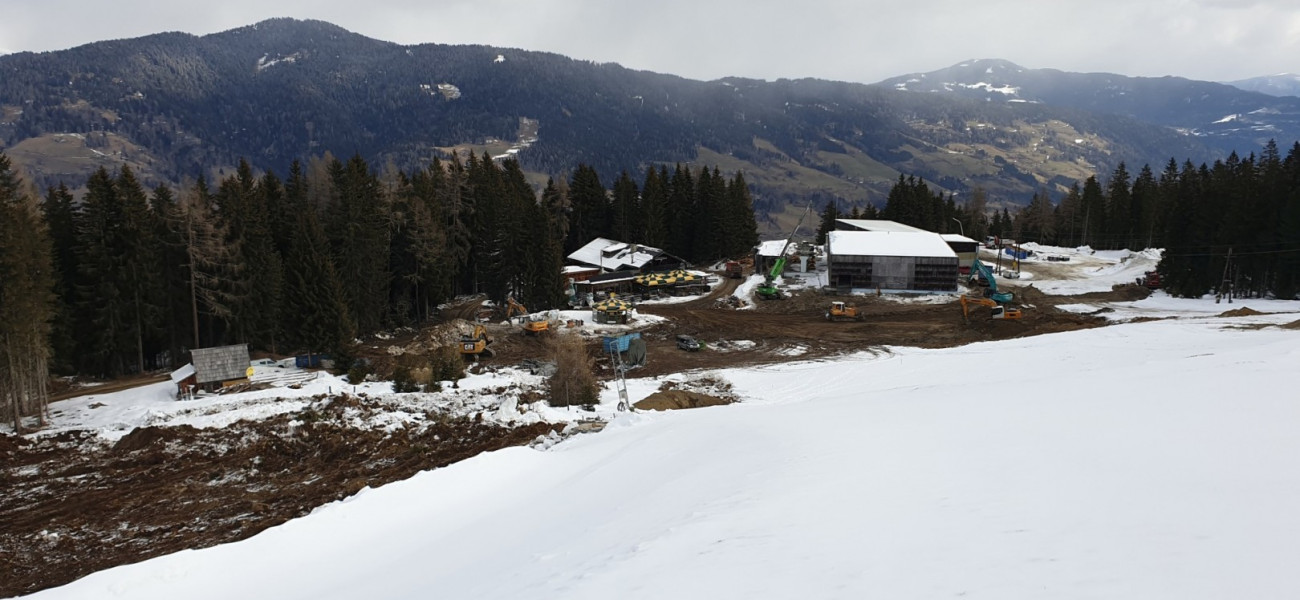 In der dritten Märzwoche ist die Talstation der alten Ochsenbergbahn bereits restlos abgebaut, gleich daneben haben schon die Aushubarbeiten für die neue Gondelgarage bei der Mittelstation begonnen.